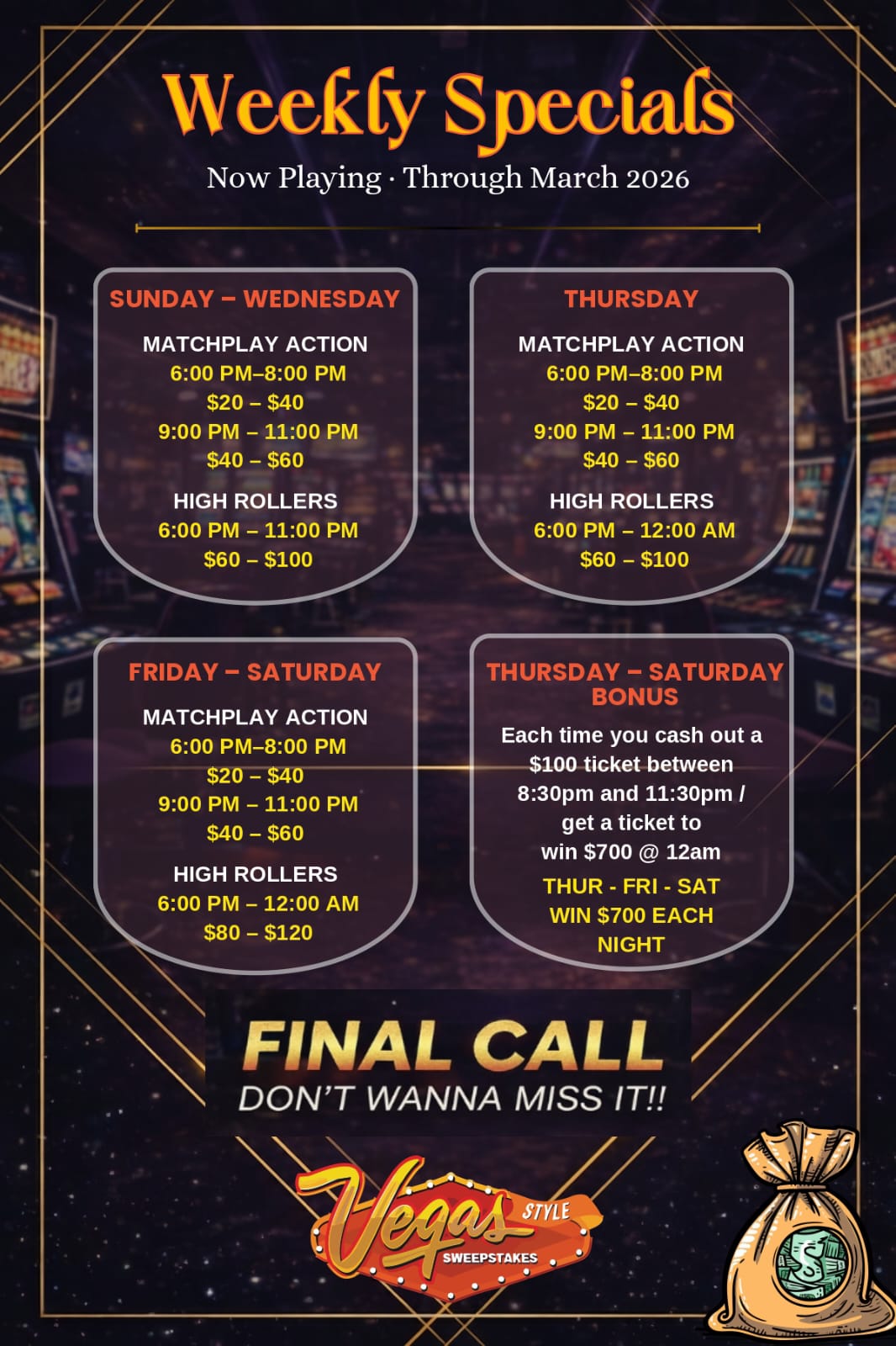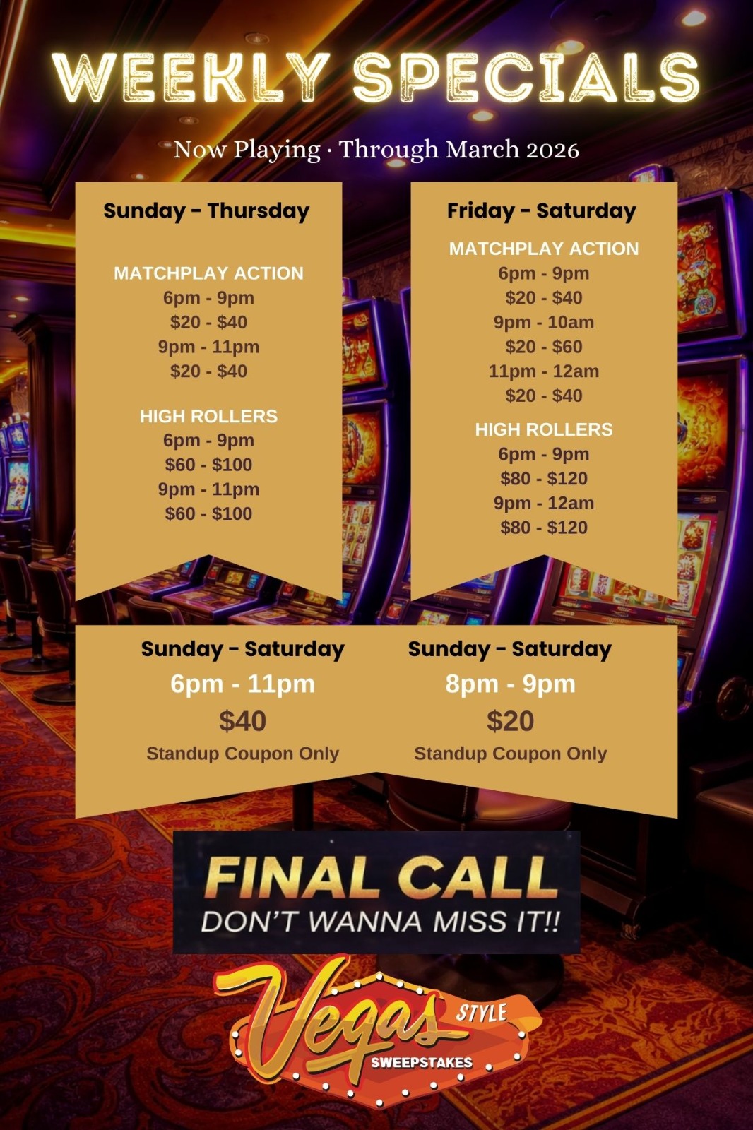 Experience a fun and friendly gaming atmosphere at Vegas Style Sweepstakes and Entertainment. We remove you from the ordinary with our exceptional cashiers and attentive floor staff. New and old friends will cheer you on as you hit your lucky streak and win real money. Choose your favorite game and let the good times roll!